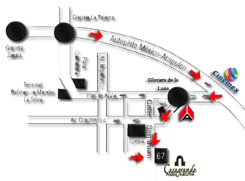Instrucciones: Llegando de la ciudad de México, se sigue por el libramiento rumbo a la ciudad de Acapulco, al llegar a la salida que dice Av. Plan de Ayala toma la salida rumbo hacia el centro. Aproximadamente a 1.5 km se encuentra la Glorieta de la Luna, habrá que rodearla para tomar la calle Cuauhtemoc que empieza donde se encuentra el Aurrera y Farmacias del Ahorro, se continua sobre toda la Av. Cuauhtemoc hasta encontar la calle San Juan para referencia hay una Iglesia en la esquina, y a 400 mts se encuentra CASAGRANDE Posada Ejecutiva.
